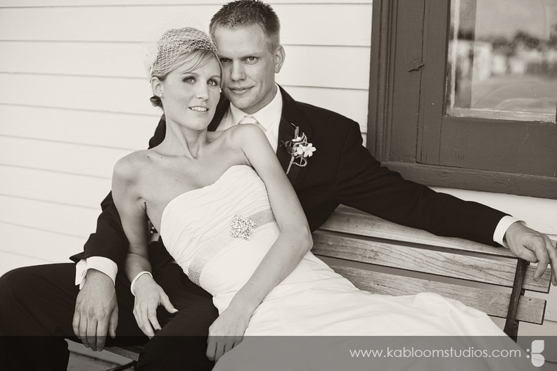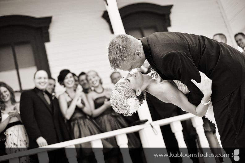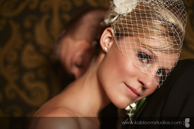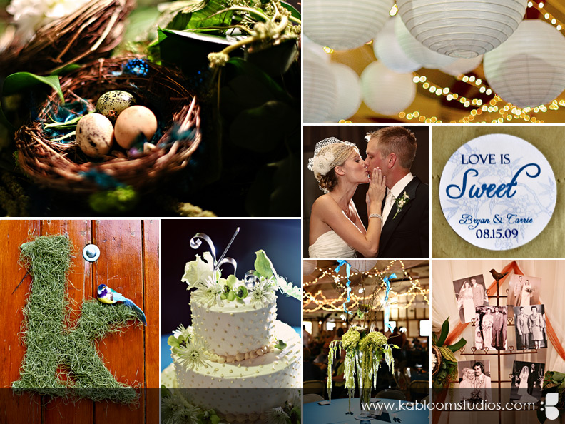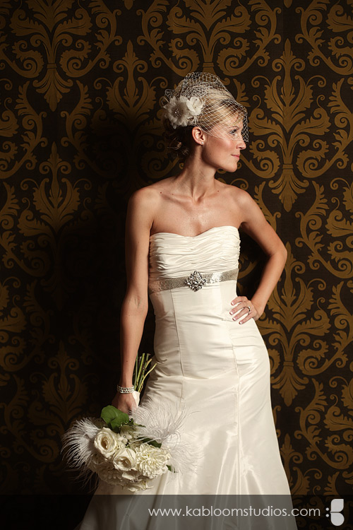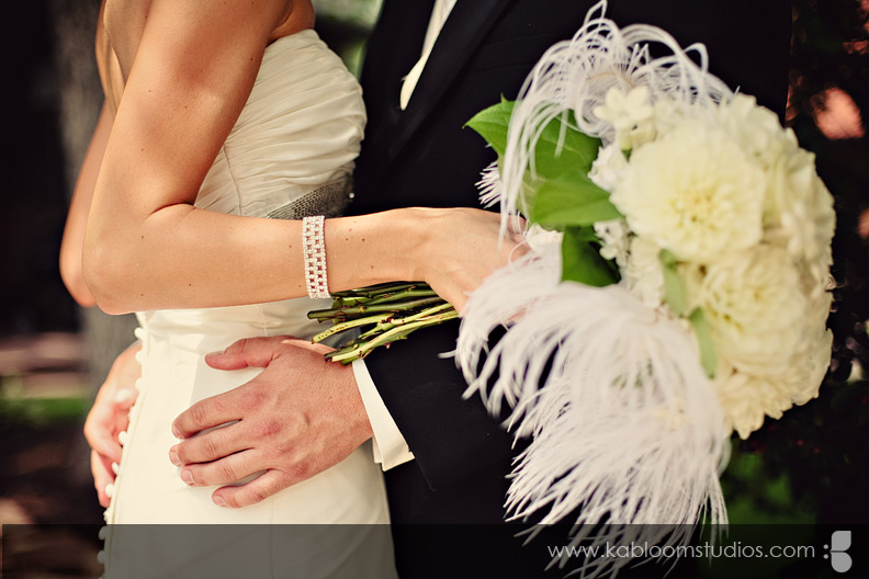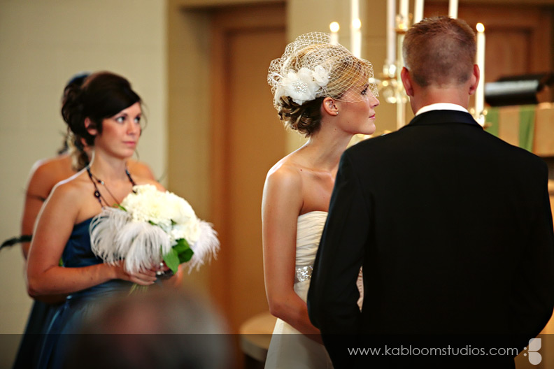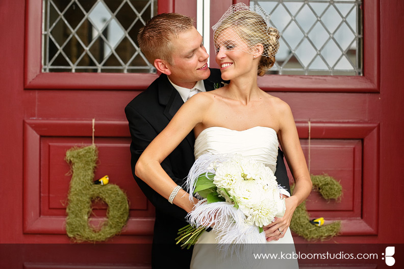 As you'll see a few shots later, I was pretty much obsessed with Carrie's bird cage veil. :) You can get one like it from DistinctiveVeils.com. Let's not forget the beautiful monogrammed door decorations.... together with the ostrich feathers in the bouquet... the scene was set for a bird/nest theme kissed with dash of vintage charm. Tré glam!