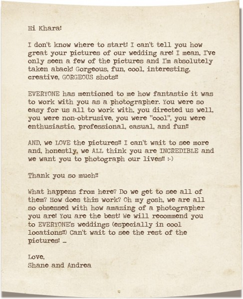 I just got home from visiting my new nephew Cole (yay!) to find this treasure in my in-box. You'd never believe how much a simple note like this means to me. Andrea + Shane.... you totally rocked my world! Thank YOU!